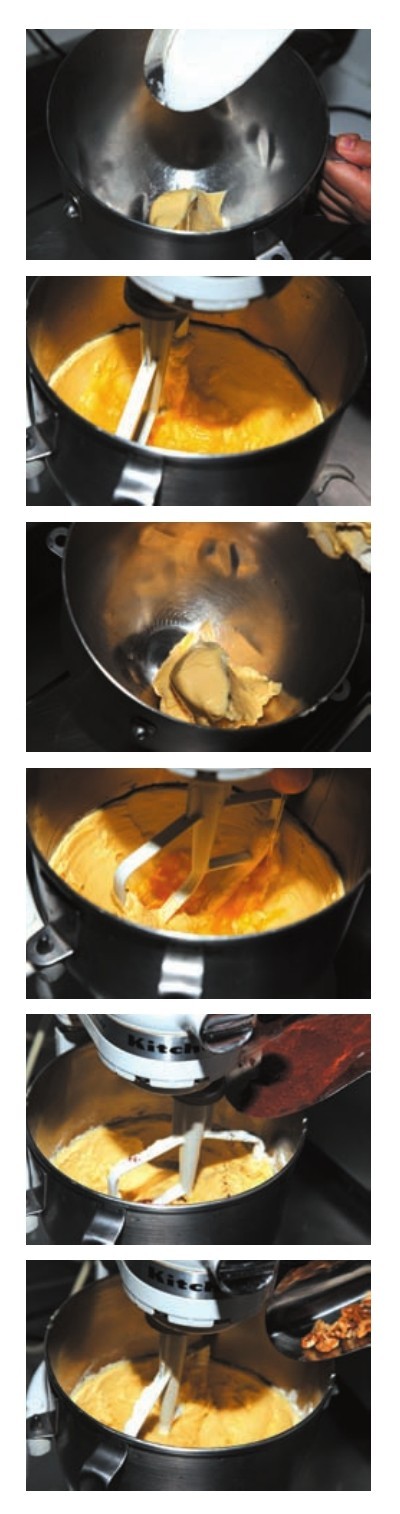 材料 黄油70克,奶油芝士190克,糖700克,鸡蛋6个,蛋糕粉250克,杏仁粉180克,可可粉120克,泡打粉、盐各5克,核桃仁200克。