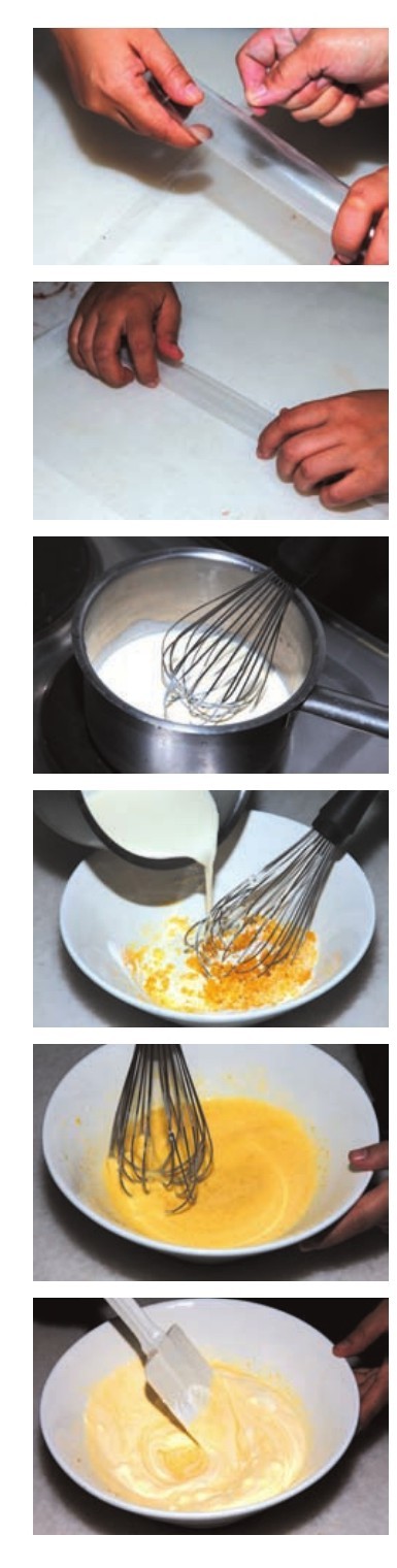 1 牛奶放入锅中煮开,再冲入加有糖的蛋黄中。