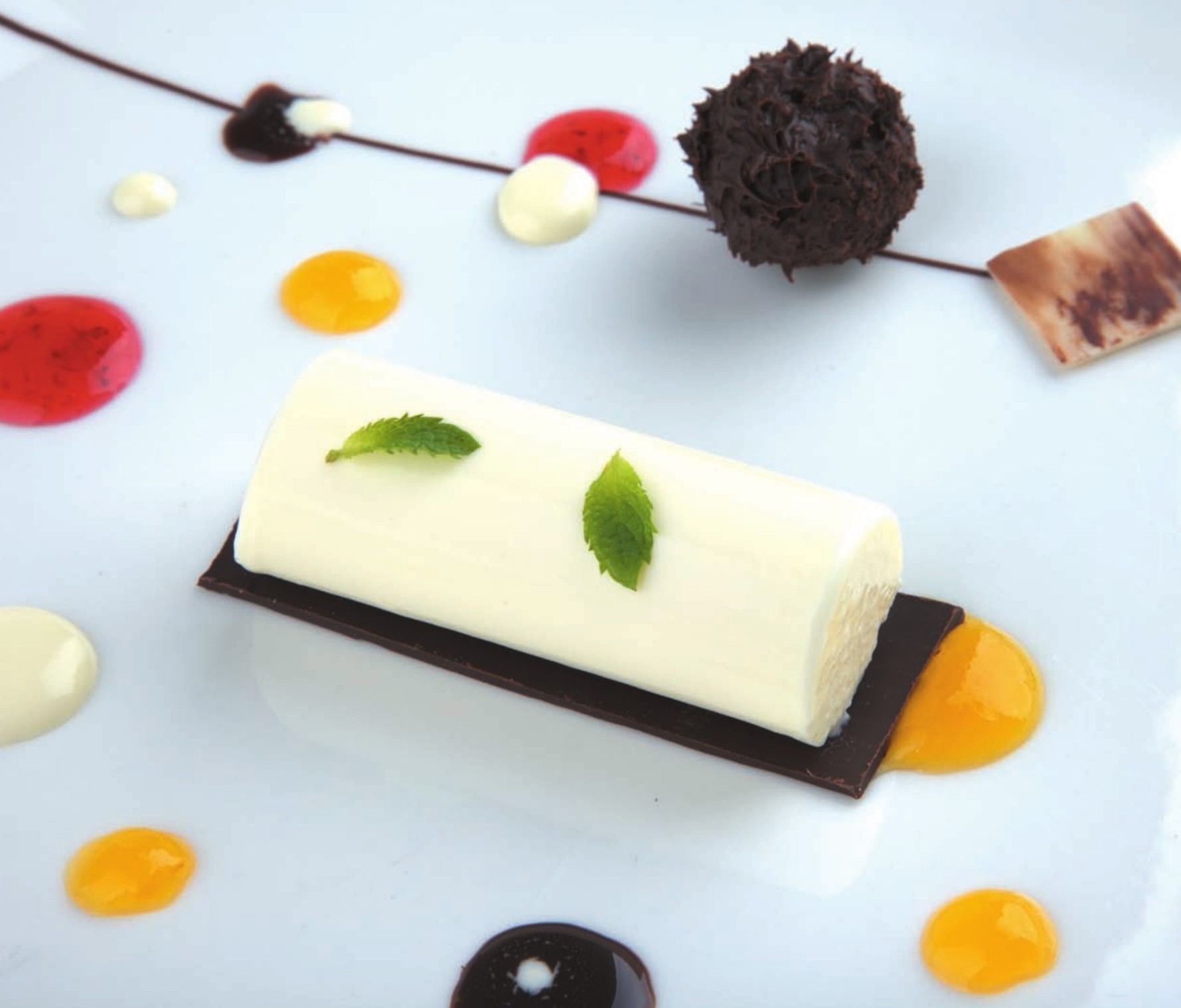 材料 牛奶70克,蛋黄20克,糖15克,白巧克力100克,鱼胶片5克,淡奶油150克。