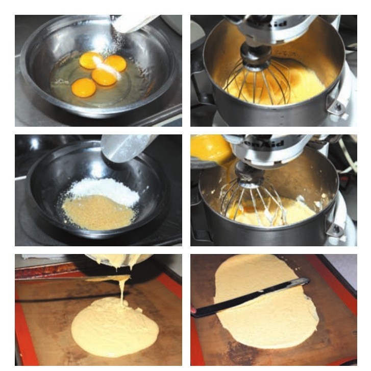 1 分别打发100克糖、鸡蛋和280克糖、蛋清,打发后混合在一起。