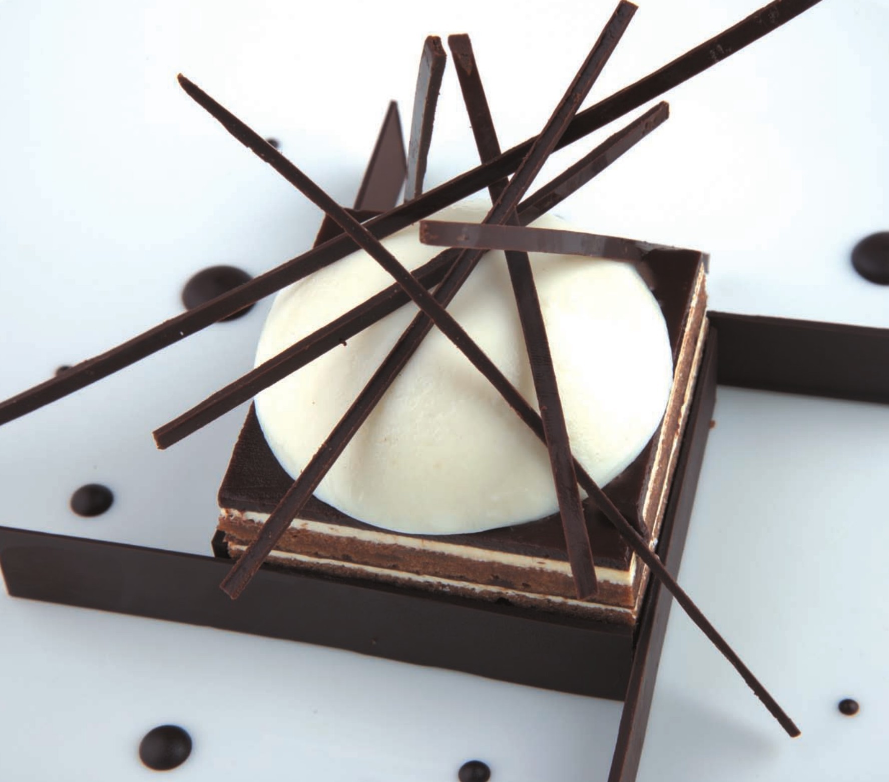4 把烤制好的蛋糕坯抹上巧克力酱,切成方形,装盘。