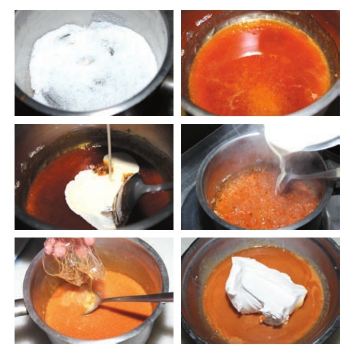 1 Fry sugar into caramel, pour 450g unsalted butter and boil until melted.