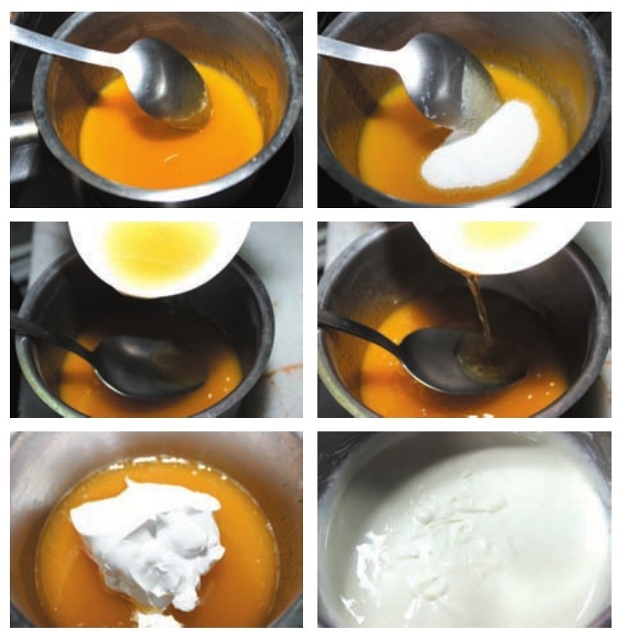 2 Put some unsalted butter foam and fish gelatin into mango puree to mix well.