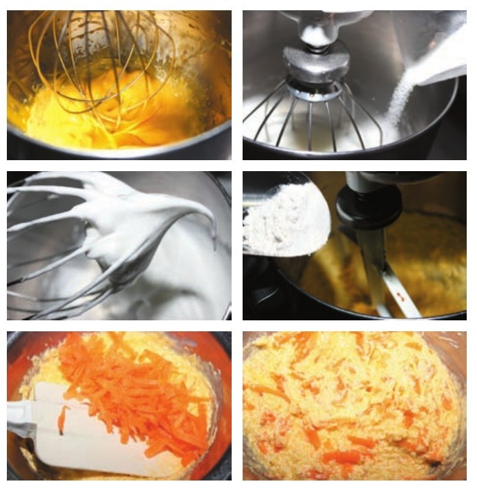 材料 蛋黄、蛋清各5个,糖260克,杏仁粉225克,蛋糕粉130克,泡打粉2克,胡萝卜末375克。