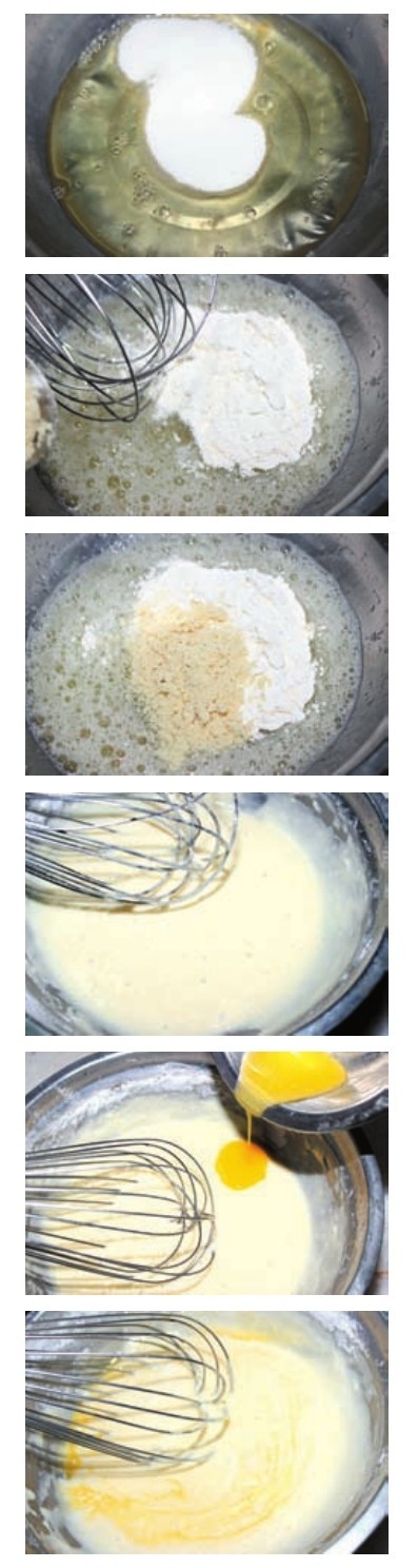 1 Put egg white, sugar, almond powder and cake power in turn and mix them to a smooth paste.
