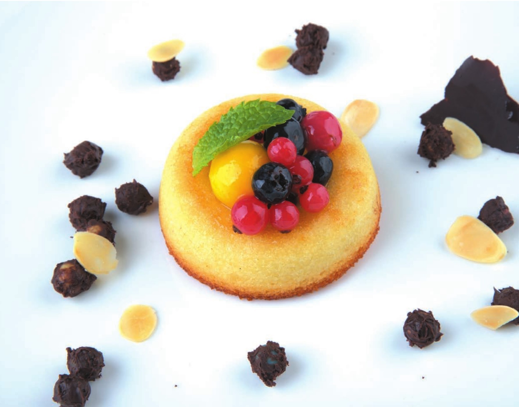 4 取出冷却,用新鲜水果、干果仁和巧克力碎片装饰搭配即可。