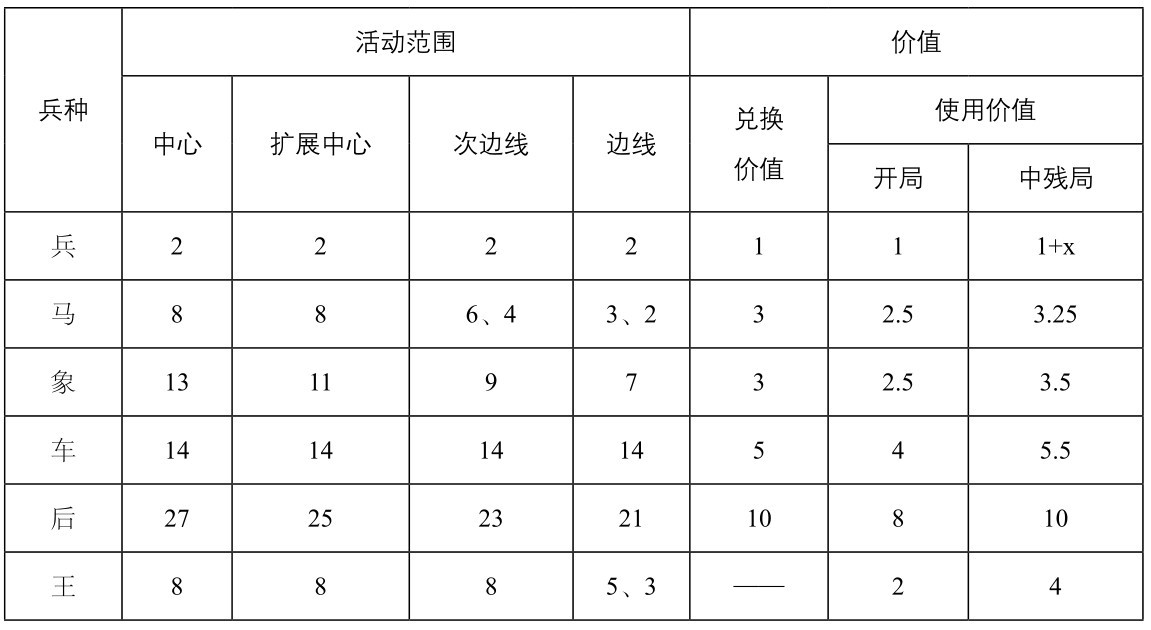 表中棋子活动范围的单位是“格”,棋子价值的单位是“分”。