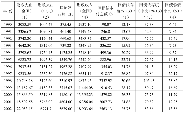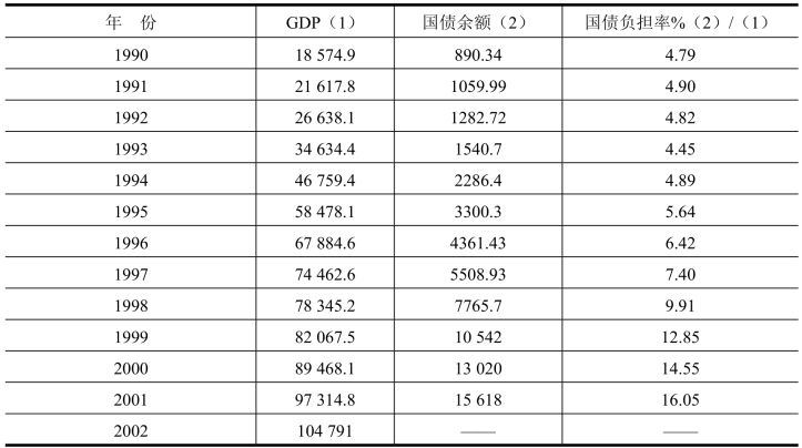 (4)我国国债规模的综合评价。从应债能力指标看,我国的国债规模并不太高,仍有进一步增发的空间,而从偿债能力指标来看,我国的国债规模已经过高,必须及时压缩,以防范财政风险。而且,我国现阶段存在着大量以政府财政信用潜在担保、最终必须由政府偿还的隐性债务,如国有银行不良贷款、地方财政无力消化的债务、国家财政对社会保障资金的欠账以及其他公共部门债务等。其中仅国家政策性银行发行的金融债券一项,2001年年底就已达到8534亿元。因此,计算国债负担率时如果考虑隐性债务,我国的“综合负债率”将会大大提高,实际应债能力需要向下调整。