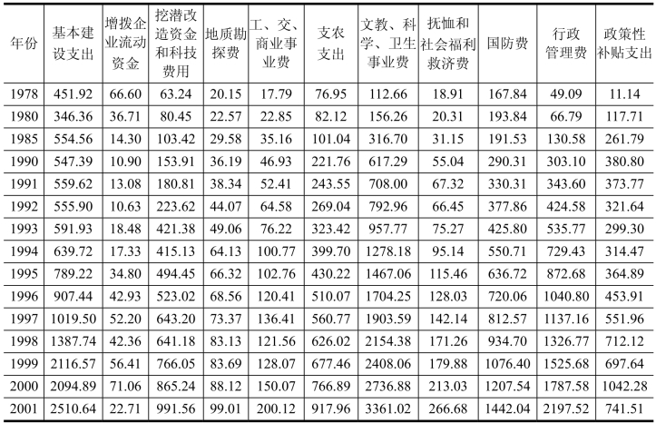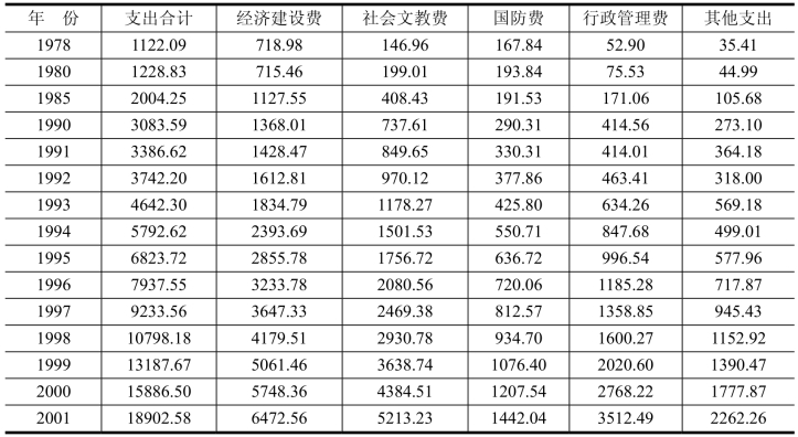 按照国家职能对财政支出分类,能够反映出国家政治经济活动的全貌和各时期政府职能范围及其侧重点。如果对一国的支出结构作时间序列分析,可发现该国国家职能的演变;若对不同国家同一时期支出结构进行横向分析,则可以揭示各国国家职能的差别。例如见表5-1,我们可以看出改革开放以来,在各项财政支出中经济建设支出金额最大,体现出我国以经济建设为中心,大力发展经济的政策。