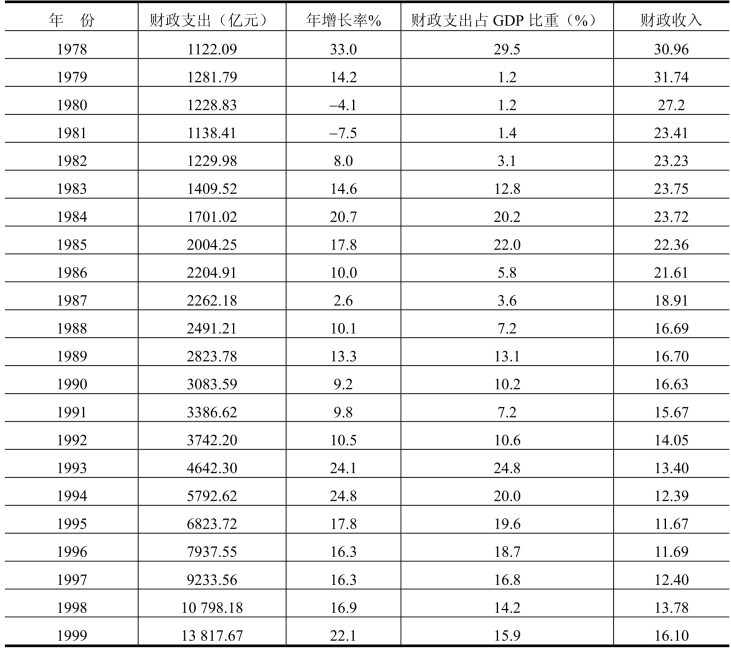 (1)财政支出绝对数量快速增长。1978年为1122.09亿,1999年[数据来源于《中国统计年鉴》(2000)]则达到13 187.67亿,增长了10倍以上,平均年增长率接近12%。