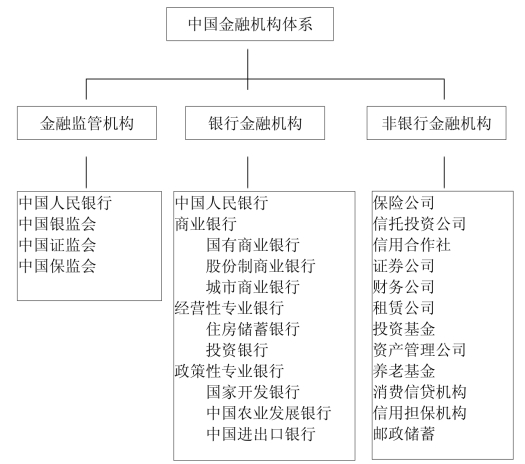 目前,我国已经初步建立起在中央银行宏观调控和监管下,政策性金融与商业性金融分离,以国有银行为主体,股份制商业银行、城乡信用合作社、非银行金融机构和外资金融机构并存、分工合作、功能互补的金融机构体系,如图8-1所示。