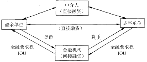 由上图可见,金融市场融通资金的具体途径有两个:直接融资和间接融资。直接融资由赤字单位(最终借款人)直接向盈余单位(最终贷款人)发行 (出卖)自身的金融要求权(JOU),其间不需经过任何金融中介机构,或虽有中介人,但明确要求权的仍是赤字单位和盈余单位,双方是对立当事人,这种资金融通的方式称为直接融资。当盈余单位和赤字单位无直接契约关系,双方各以金融中介机构为对立当事人,即金融机构发行(卖出)自身的金融要求权,换取盈余单位的资金,并利用所得的资金去取得(买进)对赤字单位的金融要求权,这种资金融通的方式称为间接融资。