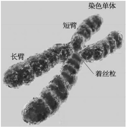 我们知道,细胞是透明的,用显微镜看天然的细胞,看不清里面有什么结构。因此,科学研究者们很早就试着用各种植物色素来染细胞,想看清细胞里有些什么细胞器。苏木精是最常用的一种碱性染料,它是从一种叫苏木的树木里提取出来并经过加工后制成的。研究者发现,细胞里有一种分散在细胞核里的物质,能用苏木精碱性染料染成蓝紫色,看起来像晴天上的乌云一样,非常明显。 这种物质就被叫做“染色质”。 而且,当细胞即将发生分裂的时候,染色质会逐渐变成一条条的东西,每一条都有一定的形状和大小,而且总是成双成对(图8)。 这些东西同样能被苏木精染成蓝紫色,所以叫“染色体”。 一对染色体中的一条叫做“染色单体”。