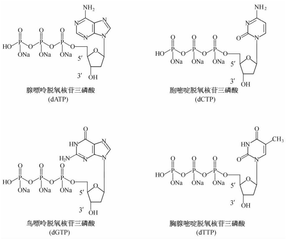 DNA是四种核苷酸按碱基配对规则连接而成的双链螺旋。 这里我们要详细解释一下这四种核苷酸(图12)。 这四种核苷酸是由嘌呤或嘧啶(就是碱基)连上一个核糖分子,核糖分子上又连上一个或几个磷酸分子构成的。 核糖分子上有5个羟基,都编了号,从1到5。 和碱基相连的那个羟基是2号,和磷酸分子相连的羟基是5号。 因此,当构成DNA链以后,科学家就把DNA链的两端也编了号,和核糖的5号羟基连接的那个磷酸分子所在的一端,叫做“5’端”(“’”读“撇”——笔者注);核糖分子还有一个3号羟基,和3号羟基连接的磷酸分子所在的一端就叫做“3’端”。 这两个端头的性质可不一样,我们在讲DNA复制的时候就要讲。而且,参加DNA复制的那四种核苷酸,“尾巴”上拖着的磷酸分子不是一个而是3个,所以叫做“脱氧核糖核苷三磷酸”。 这些核苷三磷酸的磷酸-磷酸键里,储存着大量的化学能量,像压紧了的弹簧一样。 这些能量是供DNA形成新链时用的。 在合成DNA的时候,化学能像弹簧弹出似的释放出来,同时脱氧核苷三磷酸“尾巴”上的后面两个磷酸分子(连在一起的两个磷酸又叫焦磷酸)就脱落掉,而头一个磷酸分子就和下一个核苷酸的核糖上的3’羟基通过磷酸二酯键共价连接起来。 因此,DNA合成(复制)是从5’端向3’端进行的。