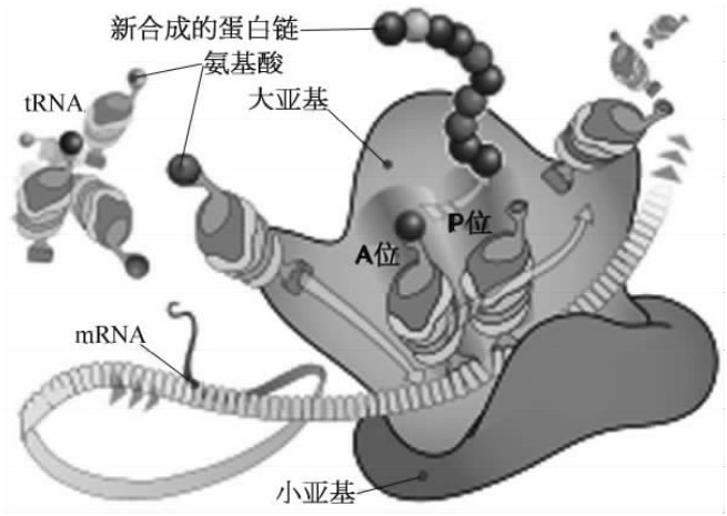 在细胞质里,专门的酶把氨基酸与它的tRNA连接在一起,准备合成时使用。 当mRNA进入细胞质时,在细胞质里游荡的核糖体大小亚基就迎上去,把mRNA夹在中间;mRNA在核糖体里并不是被包得紧紧的,而是有几处空隙让mRNA的部分序列露出来。 连着起始氨基酸的tRNA就把“手枪柄”对着露出的mRNA靠上去,粘在核糖体的A位上,“枪柄”上的三个互补码和mRNA上的起始码准确地合在一起。 然后第二个连着氨基酸的tRNA同样靠上来,与mRNA上起始码后面第一个密码子精确结合,同时头一个tRNA带着它的氨基酸转到核糖体的P位。 这时两支“枪”的“枪口”上的两个氨基酸就在核糖体上的酶的作用下互相连接。此后头一个tRNA从核糖体上掉下去,第二个tRNA转到原来第一个tRNA占据的位置——P位,第三个连着氨基酸的tRNA又“停靠”上A位,核糖体的酶就使第三个氨基酸再连接在第二个氨基酸的后面。 这个过程继续进行,多肽链就继续延长,直到mRNA上的密码全部用完、到达终止码时为止。 最后,新合成的蛋白质多肽链就(当然还是在相关的酶的作用下)脱离核糖体,被运送到它要发挥功能的地方。 而大小核糖体重新分开,再在细胞质里游动,去寻找下一条mRNA。 从mRNA到蛋白质的这个过程叫做“翻译”。