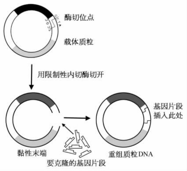 为了把“蛋白A”基因的DNA连接到质粒DNA上去,科学家们先找到质粒上在RNA聚合酶结合位点后面有限制性内切酶酶切位点的地方,用那个限制性内切酶把DNA切成单链,做成黏性末端。 同样,把“蛋白A”基因的DNA两端也弄成同样的黏性末端(可以用人工合成的办法,也可以用酶切的方法)。