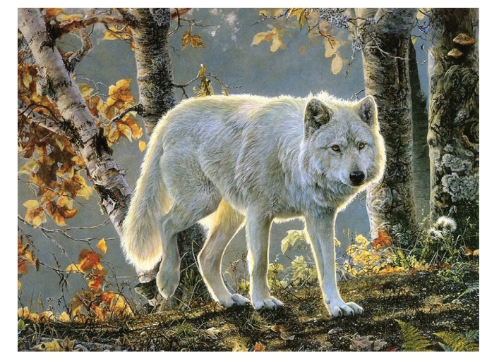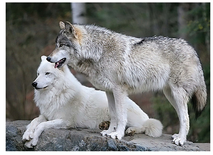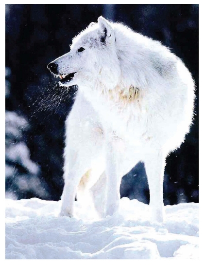 北极狼是灰狼唯一在其原始分布地的亚种,又叫白狼。北极狼生活在北极地区。它们的皮毛雪白,与北极的环境融为一体,它们过着群居生活,通常是20~30只组成一个种群,由一只雄性和一只雌性共同领导。它们的猎物主要是更大的食草动物,如驯鹿、麝牛等。一只北极狼一天能吞下大约10千克肉,在没有食物的情况下,它们也会去吃腐肉。成年北极狼仅仅3英尺高,长得很像一只有绅士风度的狗。这种狼的颜色有红色、灰色、白色和黑色。北极狼会用林子里的灰色、绿色和褐色作为掩护,北极狼有着一层厚厚的毛,它们的牙齿非常尖利,这有助于它们捕杀猎物。
