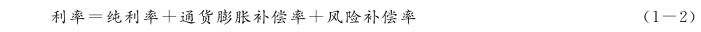 正如任何商品的价格均由供应和需求两方面来决定一样,资金这种特殊商品的价格——利率,也主要是由供给与需求来决定。但除这两个因素外,经济周期、通货膨胀、国家货币政策和财政政策、国际经济政治关系、国家利率管制程度等。对利率的变动均有不同程度的影响。因此,资金的利率通常由三部分组成:纯利率、通货膨胀补偿率和风险报酬率。利率的一般计算公式可表示如下:
