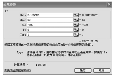 假如某人每月初向银行存入现金500 元,如果年利为2.15%(按月计息,即月息为2.15%/12)。如果想知道5年后的存款总额的现值是多少,可以使用函数PV(2.15%/12,60,-500,0,1)计算,其结果约为28 470.57(保留2位小数),如图2-9所示。