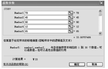 假设某公司近5年的净利润分别为A1=78、A2=45、A3=90、A4=12和A5=85。如果要估算近5年净利润的样本标准差,可以使用函数STDEV(A1:A5)计算,其结果约为33.01(保留2位小数),如图2-11所示。
