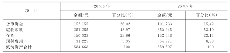 从表3-6中可以发现:该公司的流动资产结构在20×6—20×7年发生了较大的变化,变化幅度较大的项目是货币资金与应收账款这两个流动资产项目,货币资金在流动资产中所占比重从20×6年的26.02%下降到20×7年的15.42%,下降了10.6%,而应收账款在流动资产中所占的比重从20×6年的42.97%提高到20×7年的53.10%,提高了10.13%。流动资产结构的变化告诉分析者,该公司的流动资产在这两个年度内,从流动性较高的货币资金向流动性较差的应收账款发生了流动,而这种流动将影响企业实际的偿债能力。
