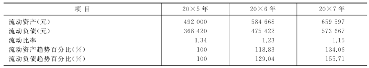 从表3-5中可以发现:在20×5—20×7年,A公司的流动资产与流动负债都呈增长趋势,在流动资产与流动负债之中,流动负债的增长速度快于流动资产,20×6年流动负债的增长速度较流动资产的增长速度快10.21%,而20×7年流动负债的增长速度较流动资产的增长速度快21.65%。表3-5中的数据显示该公司的偿债能力在减弱,从发展趋势上分析,企业偿债能力下降的主要原因是流动负债的增长速度过快。