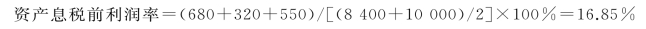 据表3-1和3-2中的资料,XYZ公司20×4年的净利润为680万元,所得税为320万元,财务费用为550万元,年初和年末的资产总额分别为8 400万元和10 000万元,则XYZ公司20×4年的资产息税前利润率计算如下: