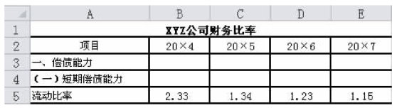选中B2:E2和B5:E5单元格区域,利用Excel中的画图工具画出XYZ公司20×4到20×7年的流动比率折线图,如图3-8所示。
