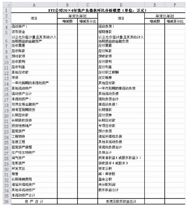 环比分析模型是将每年与上一年的相应项目的数值进行比较,如年末与年初相比增长或降低多少。这里仅以资产负债表的环比分析模型来进行说明,其他财务报表的环比分析模型的构建与分析基本相同。