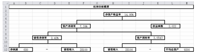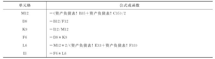 (1)将利润表中的净利润数据填入到B12单元格中,将销售收入净额数据分别填入F12与I12单元格中。在“杜邦分析模型”工作表的相应单元格中输入如表3-9所示的公式进行计算。