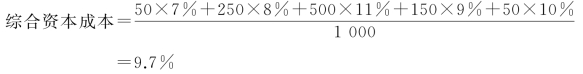 【例5-6】 某企业共有资金1 000万元,其中银行借款有50万元,长期债券有250万元,普通股有500万元,优先股有150万元,留存收益有50万元;各种来源资金的资本成本分别为7%、8%、11%、9%、10%;债务资本成本均为税后资本成本。计算综合资本成本。