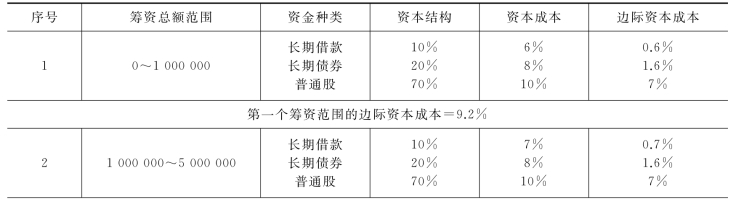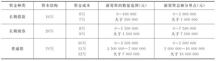 在表5-2中,新筹资总额分界点是指引起某资金种类的资本成本发生变化的分界点。如长期借款,筹资总额不超过100万元时,资本成本为6%;超过100万元,资本成本就要增加到7%。那么筹资总额约在100万元左右时,尽量不要超过100万元。然而要维持原有资本结构,必然要多种资金按比例同时筹集,单考虑某个别资本成本是不成立的,必须考虑综合的边际资本成本。