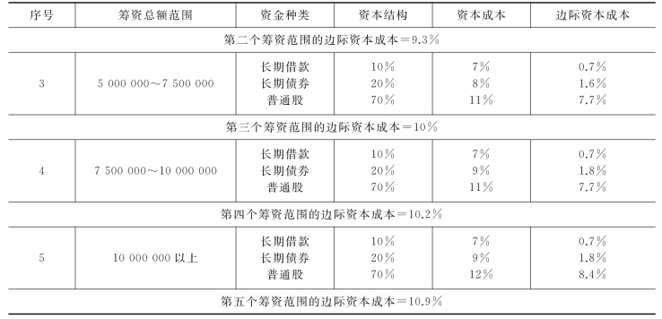 根据表5-2的计算结果可知有4个分界点,因此应有5个筹资范围。计算5个筹资范围的边际资本成本,结果如表5-3所示。