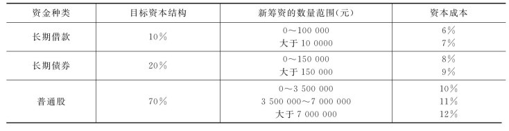 【例5-7】 华东公司现有资金1 000万元,其中长期借款100万元,长期债券200万元,普通股700万元。公司考虑扩大经营规模,拟筹集新的资金。经分析,认为目前的资本结构是最优的,希望筹集新资金后能保持目前的资本结构。经测算,随筹资额的增加,各种资本成本的变动情况如表5-1所示。