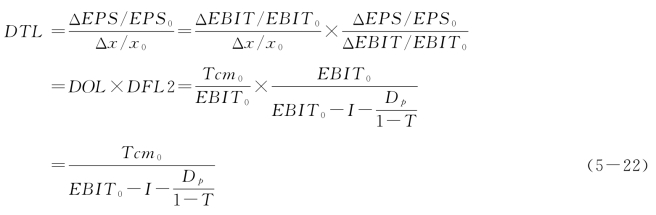 可见,综合杠杆系数可以由经营杠杆系数与财务杠杆系数相乘得到,也可以由基期数据直接计算得到。考察表5-4、表5-5中M公司的相关资料,计算各年DTL如下: