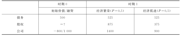 企业还可以使用部分债务资金筹集初始投资资本。假设公司除股权外还借入500万元的债务。项目现金流能够满足债务的偿付,债务利率是无风险利率5%,一年后公司偿还525万元。则此种情况下公司价值和现金流如表5-7所示。