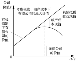 由于财务困境成本的存在,企业不可能进行100%的债权融资。同时,债务却能给企业带来税收抵免利益。权衡理论强调对财务困境成本与债务抵税利益的权衡,以期达到最佳平衡点。权衡理论最早由Myers提出,他认为由于税收原因,利息可以从企业收益中扣减,所以财务杠杆有助于给现有投资者增加企业价值。另外,如果破产和重组存在或有成本,那么带给现有投资者的企业价值会变少,所以债务结构的最优水平处在债务利息抵税收益与财务困境成本相等的点上。图5-2描述了上述结论。