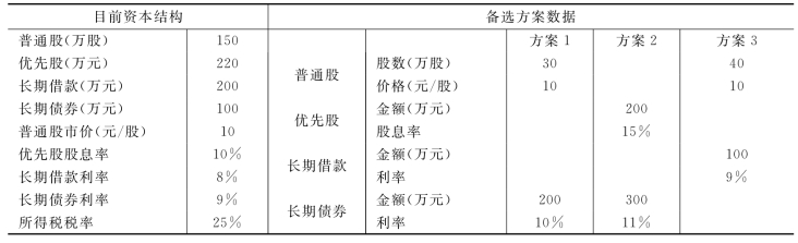 【例5-14】 M 企业目前的资本结构如表5-10所示,为了满足投资计划,企业准备再筹资500万元,现有三个备选方案,相关数据列于表5-10中。
