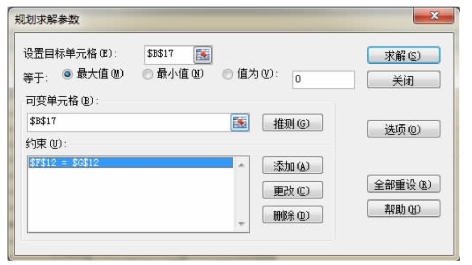 第四步:点击“数据”选项卡中的“规划求解”按钮,在打开的“规划求解参数”对话框中将目标单元格和可变单元格设置为“$B$17”,约束设置为“$F$12=$G$12”,如图5-10所示,单击“求解”按钮后得到B17单元格的值为392.33万元。