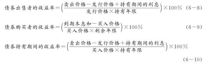 由于债券持有人可能在债务偿还期内转让债券,因此债券的收益率还可以分为债券出售者的收益率、债券购买者的收益率和债券持有期间的收益率。各自的计算公式如下: