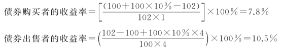 【例6-5】 某人于20×5年1月1日以102元的价格购买了一张面值为100元、利率为10%、每年1月1日支付一次利息、20×1年发行的5年期国库券,并持有到20×6年1月1日到期。请问债券购买者和债券出售者各自的收益率是多少?