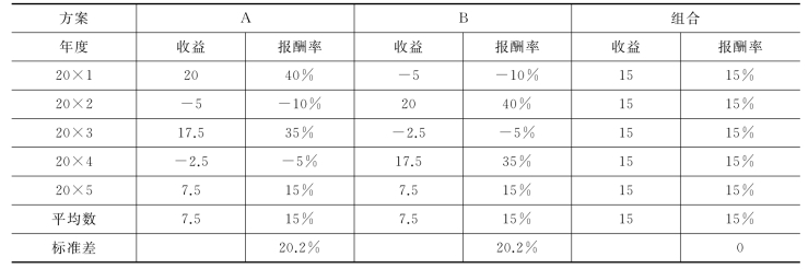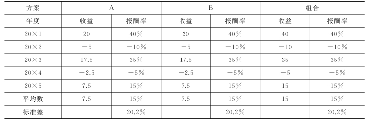 【例6-6】 假设投资100万元,A和B各占50%。如果A和B完全负相关,即一个变量的增加值永远等于另一个变量的减少值,组合的风险被全部抵消,如表6-1所示。如果A和B完全正相关,即一个变量的增加值永远等于另一个变量的增加值,组合的风险不减少也不扩大,如表6-2所示。