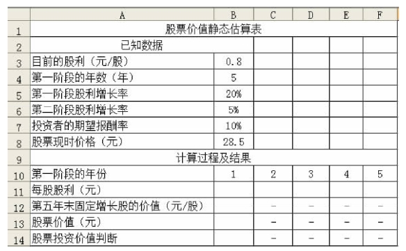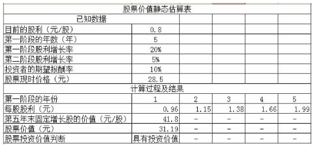 某公司目前的股利为0.8元/股。预计未来5年的股利增长率为20%,在第5年结束后股利增长率恢复到正常增长率即5%的水平。若投资者的预期报酬率为10%,计算该股票的价值。若该股票的现时价格为28.5元,判断该股票是否具有投资价值。