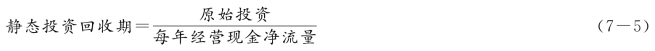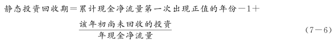 利用静态投资回收期进行决策的判断原则有两种。可以将包括建设期的静态投资回收期PP 与项目计算期n 比较,若PP≤n/2,则项目可行;否则,项目不可行。也可以将不包括建设期的静态投资回收期PP′与项目生产经营期P 比较,若PP′≤P/2,则项目可行;否则,项目不可行。静态投资回收期越短越好。