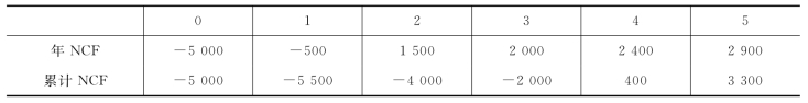 解 对于Ⅲ方案,因其经营期前4年中每年的现金净流量相等,而且累计为6 400万元,大于原始投资5 000万元,则其静态投资回收期=5 000/1 600=3.125(年)。