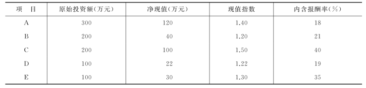 【例7-16】 现有A、B、C、D、E 五种投资项目,有关原始投资额、净现值和内含报酬率数据如表7-16所示。要求:确定投资限额为700万元时的投资项目组合。