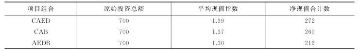 根据表7-18的数据,按投资组合决策的原则应选择CAED项目组合。很明显,项目组合的加权平均现值指数最大时,其净现值合计数也达到最大,而且是按顺序选定的第一个组合。