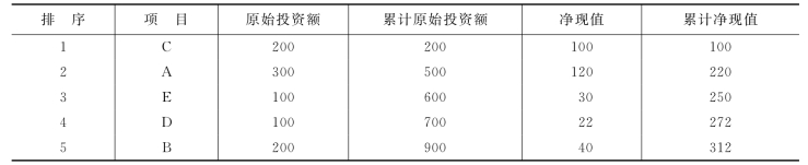 在资本限额为700万元时,首先按各项目的现值指数大小排序,并计算累计原始投资额和累计净现值数据,结果如表7-17所示。