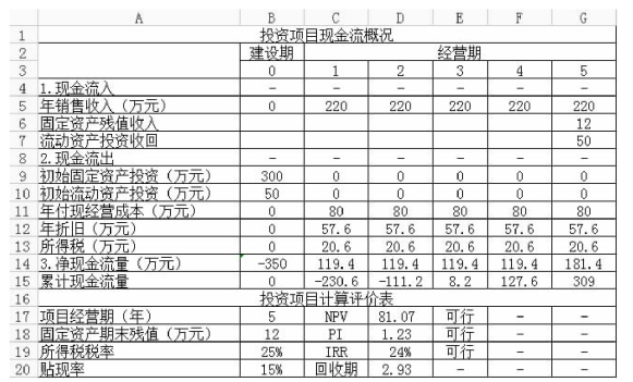 某投资项目的初始固定资产投资额为300万元,流动资产投资额为50万元,于第0年一次性投入,预计期末固定资产残值为12万元,固定资产按直线法计提折旧。该项目经营期为5年,经营期内每年销售收入为220 万元,付现经营成本为80 万元,所得税税率为25%,贴现率为15%。试计算该投资项目的净现金流量和各项评价指标,并根据各评价指标判断该项目的可行性。