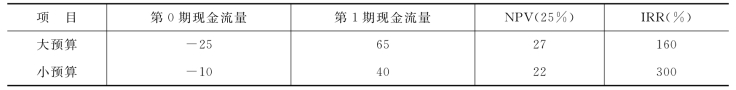 由于项目的风险比较高,折现率假定为25%。雪莉·兰星认为应该斥巨资,因其净现值比较高。斯坦利·杰佛的观点是小预算比较合适,因为内含报酬率比较高。因观点不一样,两个人展开了长时间的讨论,但最终雪莉·兰星还是说服了斯坦利·杰佛。究竟谁正确呢?